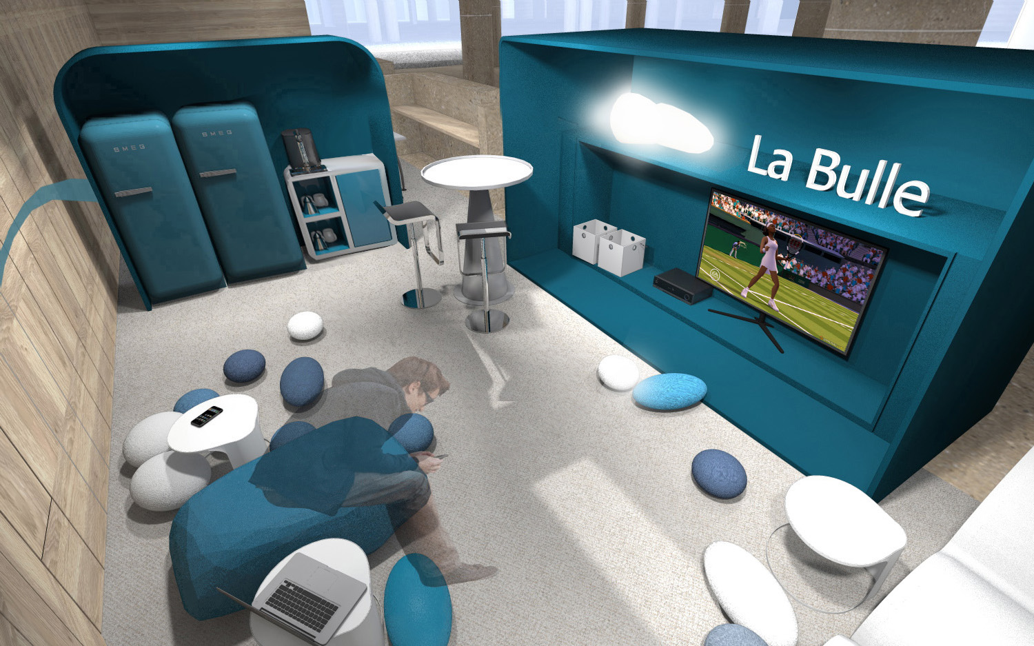 Nous participons à un concours destiné à offrir aux collaborateurs d’une banque privé un espace de détente, de jeux et de discussion informelle. « Bienvenue à la bulle » est une idée inspirée des galets du bord de mer, et du sentiment que procure l’arrivée face à l’océan au premier jour des vacances d’été.
